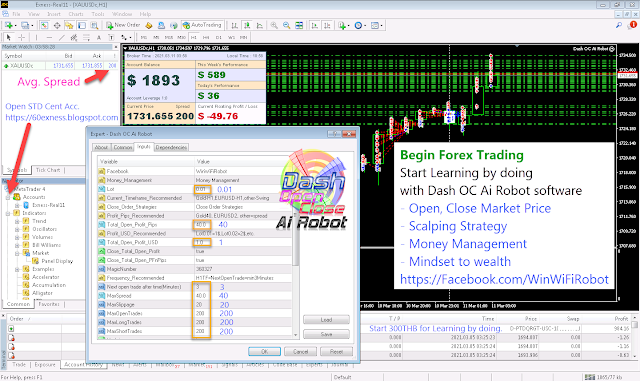 สำหรับการเทรดด้วย EA/Ai Robot จำเป็นต้องทราบการทำงานกลยุทธ์การทำกำไรของโรบอทเทรด และการเลือกตลาดให้เหมาะสมกับระบบพร้อมการตั้งค่าเพื่อให้สัมพันธ์กับทุน เรียกกว่า MM (Money Management) ในภาพได้นำเสนอการเทรดแบบเก็บกำไรระยะสั้นๆ เรียกกว่า Scalping , Swing Trade เหมาะกับทุกไทม์เฟรม โดยส่วนใหญ่จะเหมาะกับโซนไซด์เวย์ นั่นเอง แนะนำให้เลือกไทม์เฟรมมาตรฐานก่อนคือ H1 และตั้งค่าเก็บกำไรแบบยอดกำไรเป็นหน่วยตามสกุลเงินที่ท่านเปิดบัญชี เช่น THB, USD, USDcent เป็นต้น และการเก็บกำไรแบบหน่วย pips แนะนำเท่ากับสเปรดหรือมากกว่าเล็กน้อยไม่เกิน 2เท่าของสเปรด หรือศูนย์0 คือเท่ากับ0pips เนื่องจากเวลาโดนลากหรือสะสมไม้ หรือปิดไม่ลง พอกราฟวกกลับมา อาจใช้เวลา 4-12ชั่วโมง ระบบจะคำนวนปิดรวบกำไรทั้งหมดเอง